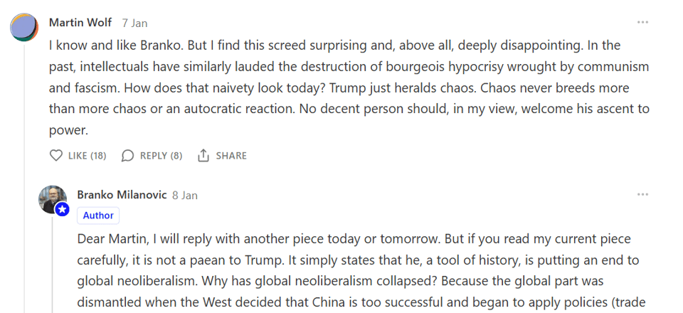 The particular target of Milanovic’s ire, however, is the supposedly globalization-friendly mainstream economists and outlets like the Financial Times that he says have cheered this end with their openly suspicious response to China’s rise, and by framing China as a technology thief, even though tech transfer as a necessary part of development. If the champions of neoliberal globalization have already abandoned it, then the inauguration on Monday is only the symbolic turning point.