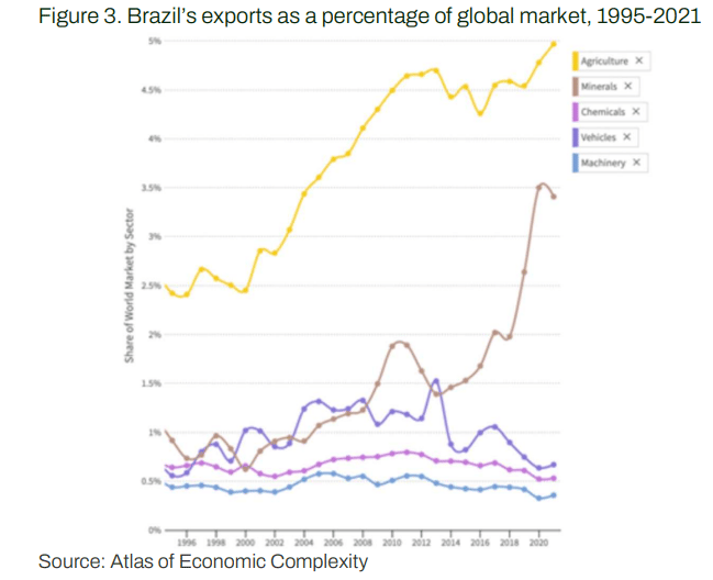 Brazil is one of many countries that de-industrialized since the 1980s. In the 1960s and 1970s the state developed high-end manufactures like airplanes and biodiesel cars. In the 1990s that began coming apart in earnest as industrial strategy was abandoned; and during the 1990s and 2000s the commodities boom saw Brazil’s “reprimarization” as exports of soybeans and crude oil and other extractives soared.