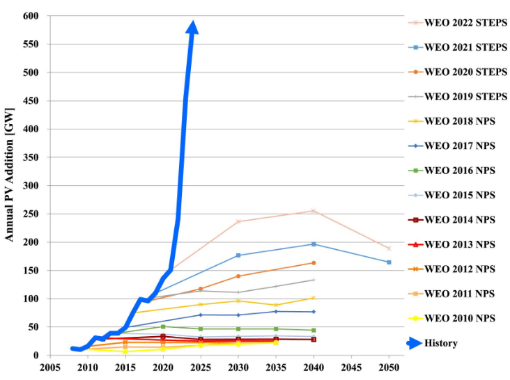 Much of their central thesis rests, weirdly, on the idea that oil demand will increase in the years to come. The evidence for this is a very poor reading of the difference between the 2024 World Energy Outlook from the International Energy Agency, and the (reportedly) 2025 WEO, which is released tomorrow. It’s not clear why these people wouldn’t understand that those two scenarios are based in very different assumptions: Current Policy Scenario assumes no new policies and no implementation of existing policies; in that sense it is the only WEO scenario that we can be 100% certain does not resemble the future. STEPS assumes only current policies will be implemented. It’s not an apples to apples comparison — unless journalists and pundits merrily carry on as though these differences don’t matter in some kind of effort demonstrate their hard-nosed realist credentials. There are many other reasons not to read too much into IEA scenarios anyway — for example, they rest on technical assumptions that, unlike the policy assumptions, are opaque. We shouldn’t need to tap the sign about the problems the WEO has had with solar in particular: