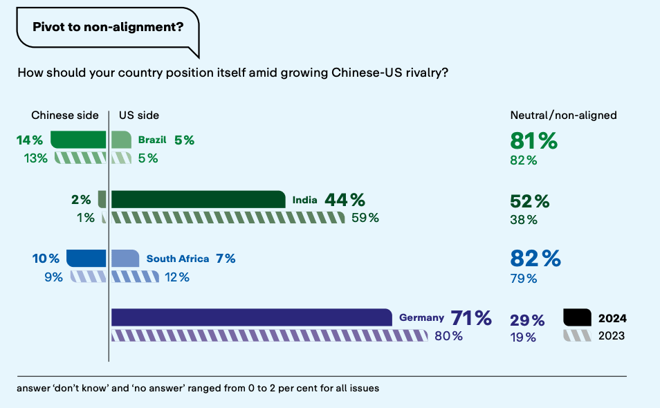 India was cooling on the US even before the Trump 2.0 inauguration; Brazil rates climate change as one of its top 3 priorities; South Africa has high hopes for BRICS and all three are supportive of non-alignment rather than siding with either the US or China. A survey by German thinktank Körber-Stiftung of policymakers, judiciary, security people and journalists in four countries has some interesting results. The accompanying report suggests some possible implications for Europe, which wasn’t especially popular with middle power respondents, either: