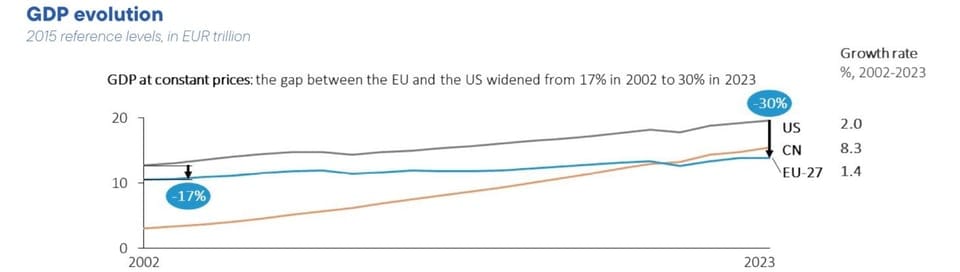 2. It has a singular message: Europe must invest in its future. Investment and growth are the only solutions for a continent slumping towards rising debt burdens, old age and being geopolitically squeezed between the US and China. Productivity is low and the lack of growth - the continent has grown far slower than the US in the 21st Century - produces political demons.