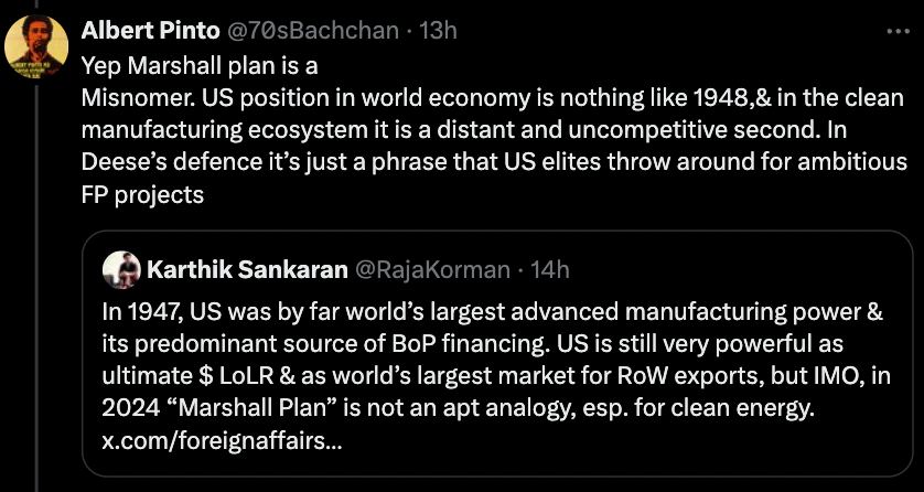 - The assumption that developing countries will be content to be US clean tech export markets: Deese’s essay draws straight lines between US green manufacturing prowess and US geopolitical triumph, via developing countries decarbonized with said US output. For Deese, the transition is “the largest capital formation event in human history”. But should developing countries simply buy green goods from the US, rather than make any themselves? Jonas Nahm honed in on this problematic assumption.https://x.com/jonasnahm/status/1826544819222495604There must be a global buildout of green manufacturing capacity; an international division of labour; and technology transfer. Else there will be few takers for neo-colonialism.