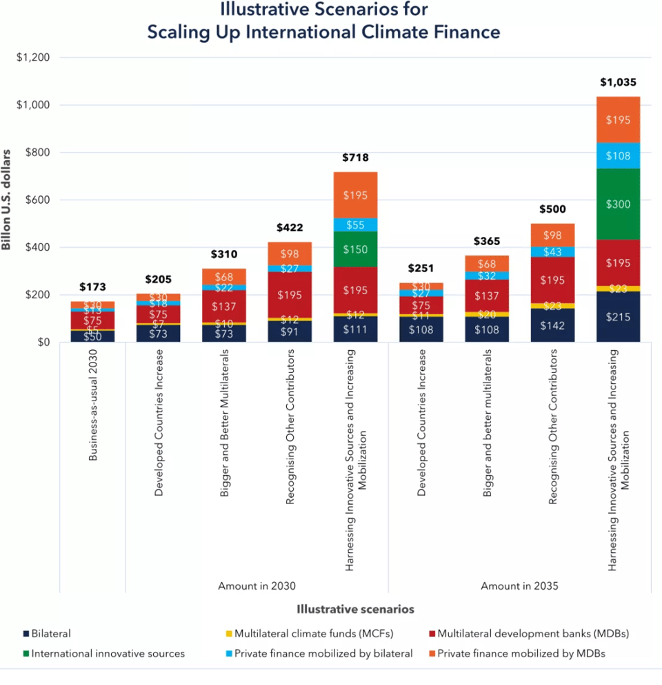 Potential sources include IMF issuances and rechannelling of Special Drawing Rights, the share of proceeds going to the Adaptation Fund from the Paris Agreement’s Article 6 Crediting Mechanism, and pollution taxes on international shipping and aviation. Estimates of revenue potential from different levies vary widely, from less than ten billion to over $100 billion per year so we kept range of values wide to allow for a variety of perspectives about which mechanisms might be deployed and how much revenues might be raised. Funding from innovative sources is likely to be focused on activities such as adaptation and loss and damage that require mainly grant financing so are difficult to fund from other sources. As a result, we do not assume they will mobilize any private finance, though in reality they may help do.