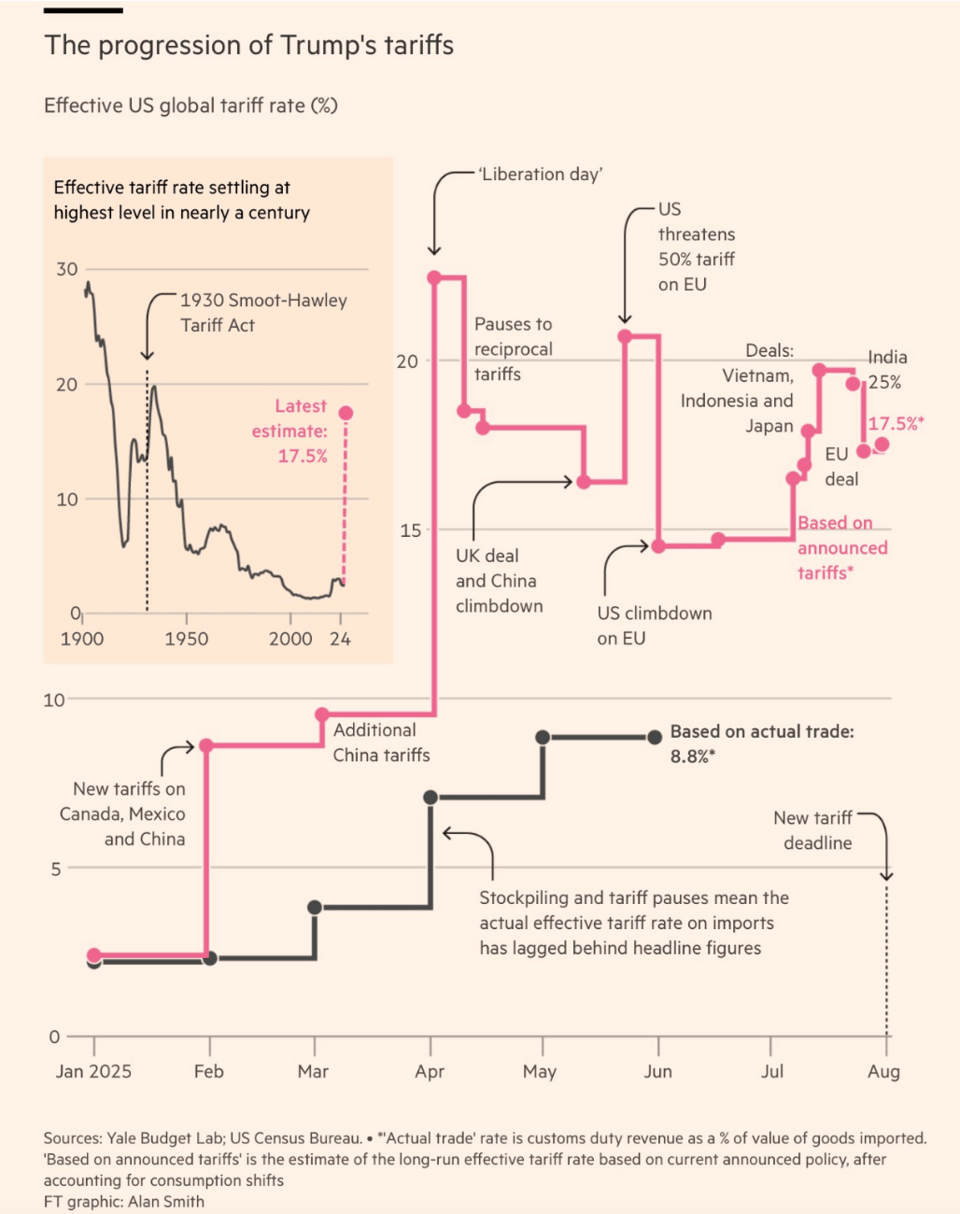 TACO is dead because the deals that Trump has made are with far higher tariff rates than seen since before the second world war. The world undeniably looks very different in a new trading order. Countries, both US allies and adversaries, have been put into one of three tariff tiers. 10-20 % (Japan, EU, South Korea), 20-30% (India, Vietnam, South Africa) more than 30% (Brazil and Switzerland quite inexplicably). How the winners and losers of this new trade order transform domestic and international politics around the world is anyones guess.